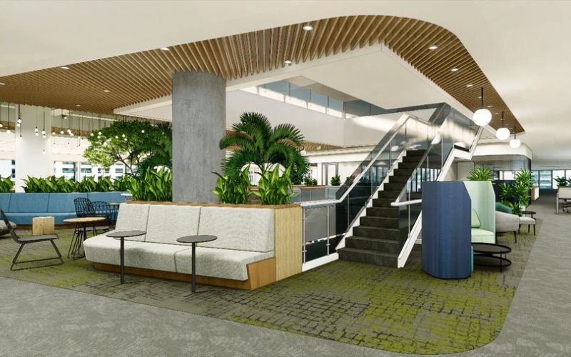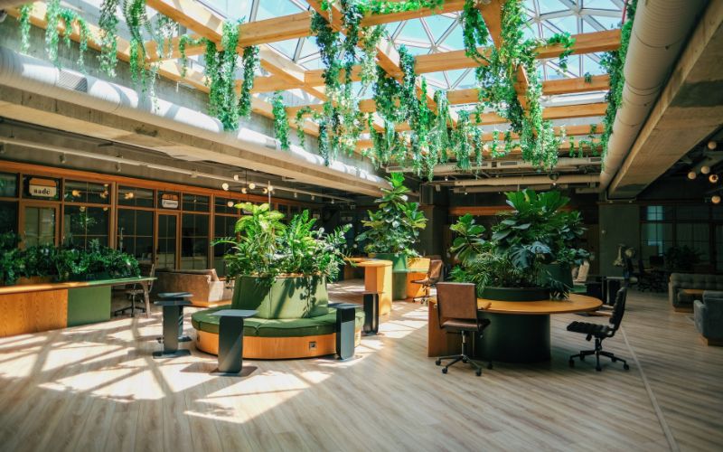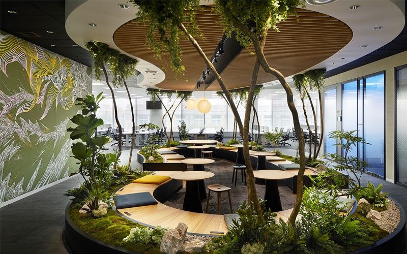Thiết kế biophilic tập trung vào thiên nhiên. Tường xanh và mái nhà cây cối xuất hiện nhiều hơn. Ánh sáng tự nhiên được tối ưu hóa qua cửa kính lớn. Âm thanh nước chảy từ đài phun nhỏ tạo cảm giác yên bình. Nhân viên cảm nhận sự cân bằng giữa công việc và cuộc sống.